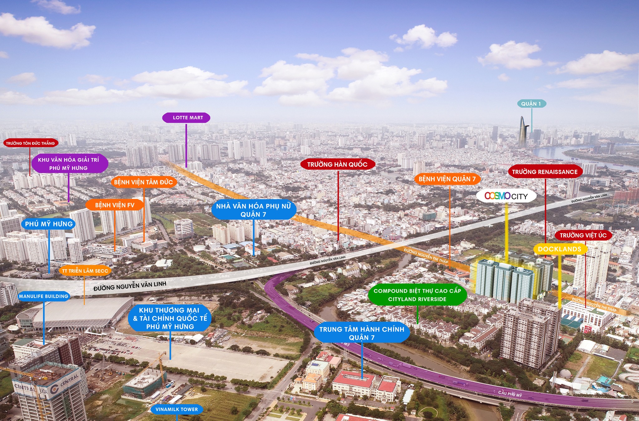 Tọa lạc trên trục đường Nguyễn Thị Thập, một trong những tuyến giao thông huyết mạch của Nam Sài Gòn, Cosmo City sở hữu khả năng kết nối nhanh chóng đến hàng loạt tiện ích quan trọng trong bán kính dưới 5km: